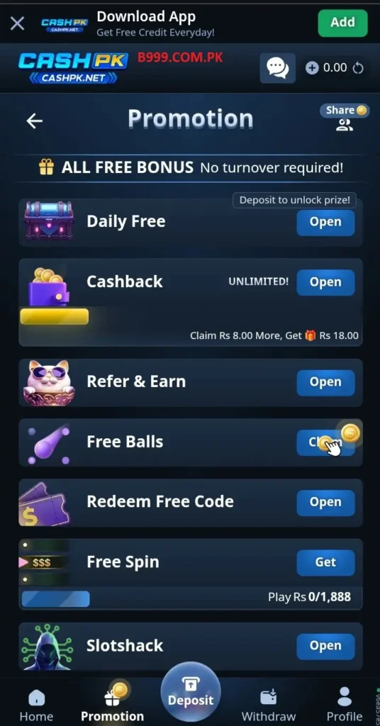 It provides easy withdrawal options for users in Pakistan. Players can cash out their earnings through Easypaisa, JazzCash, or bank transfer.
